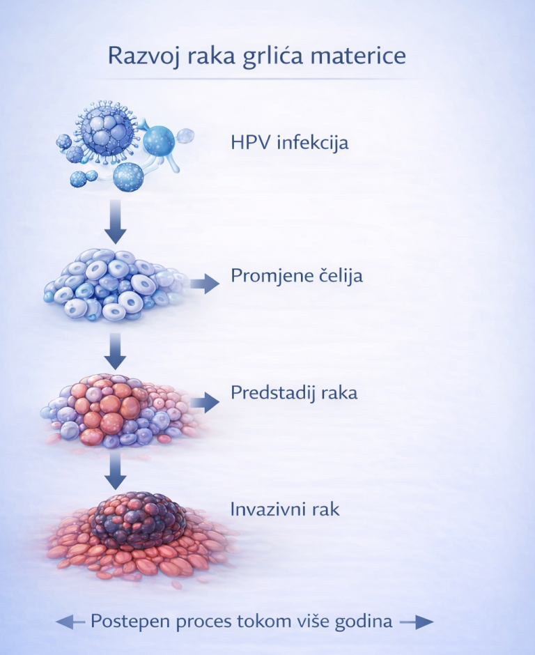 Rak grlića materice najčešće započinje mikroskopski malim promjenama na ćelijama koje dugo ostaju neprimijećene. Između HPV infekcije i razvoja invazivnog tumora može proći mnogo godina.